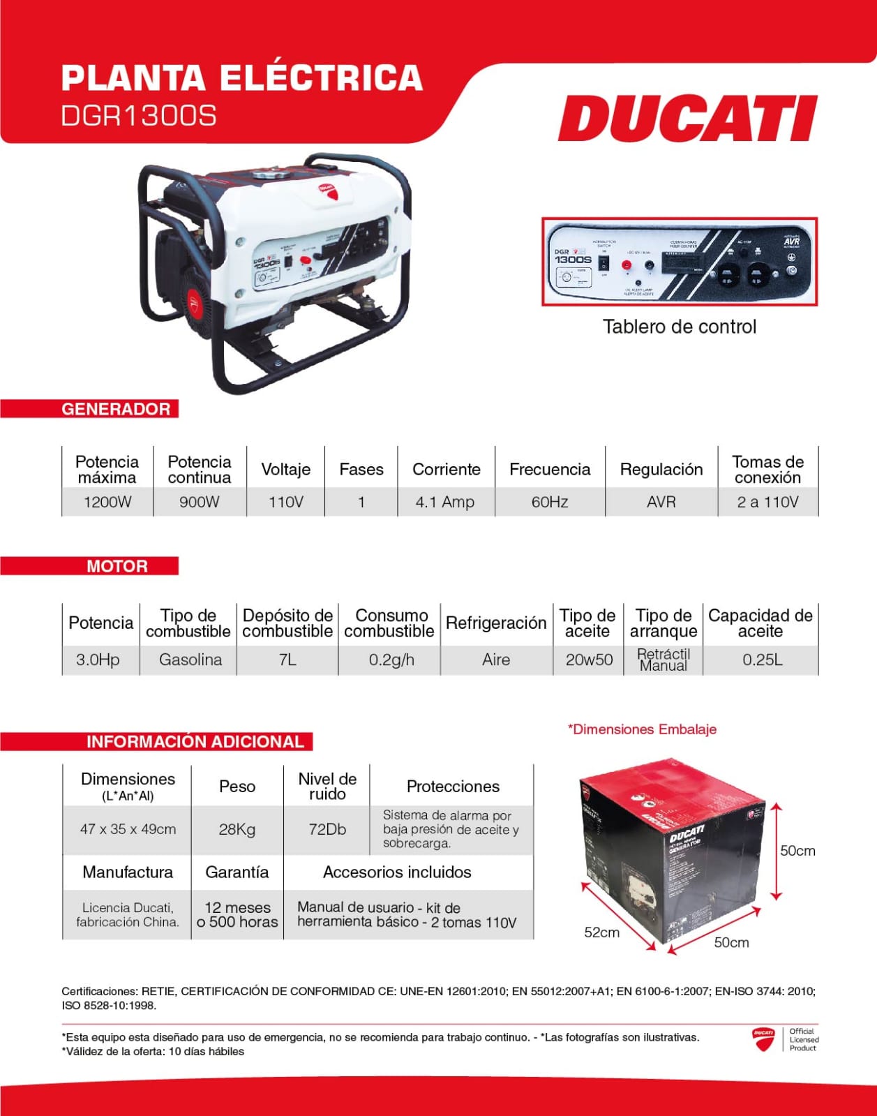 Caracteristicas de la Planta Electrica DUCATI 1200 W – DGR1300 – GASOLINA: