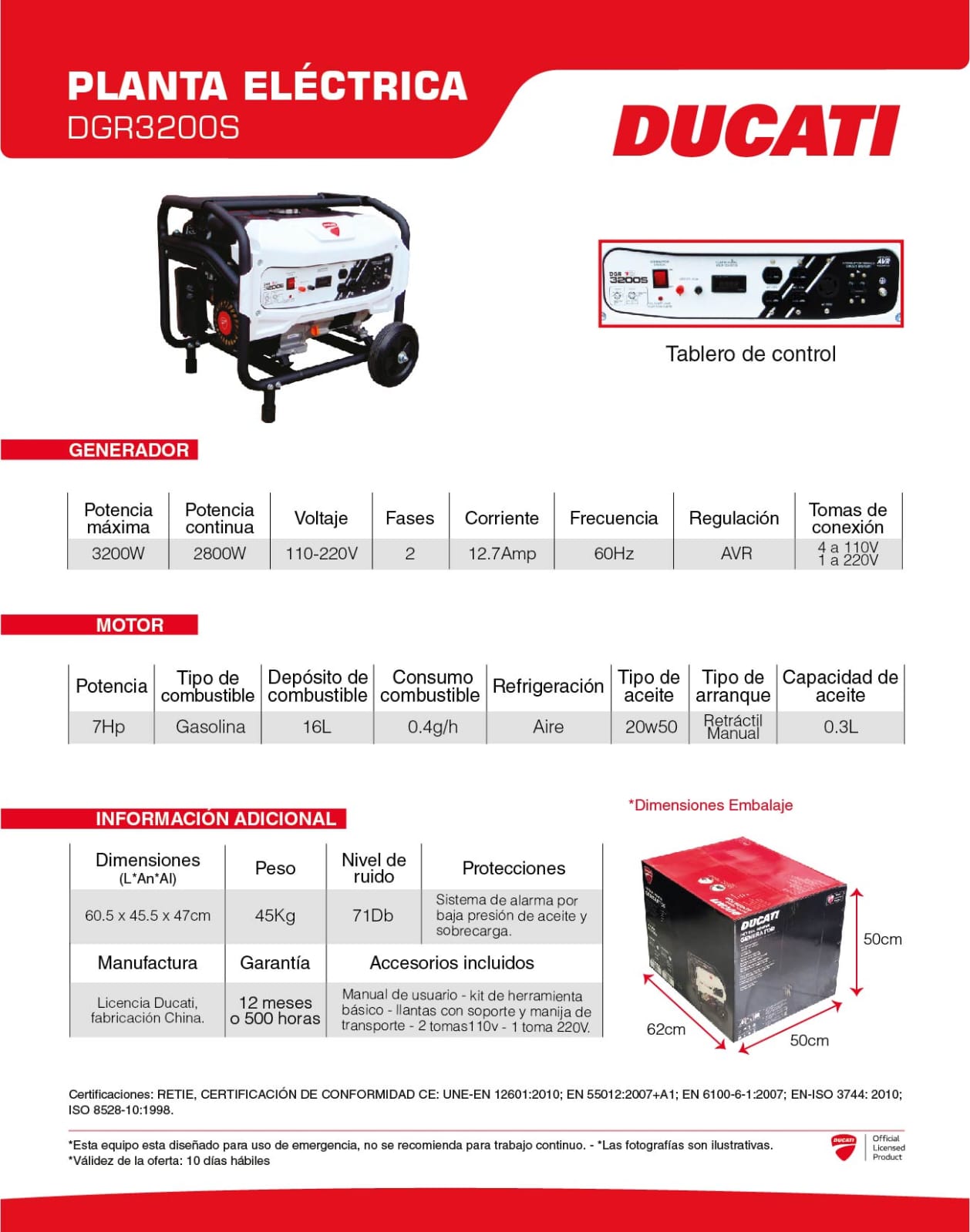 Caracteristicas de la Planta Electrica DUCATI 3200 W – DGR3200S – GASOLINA: