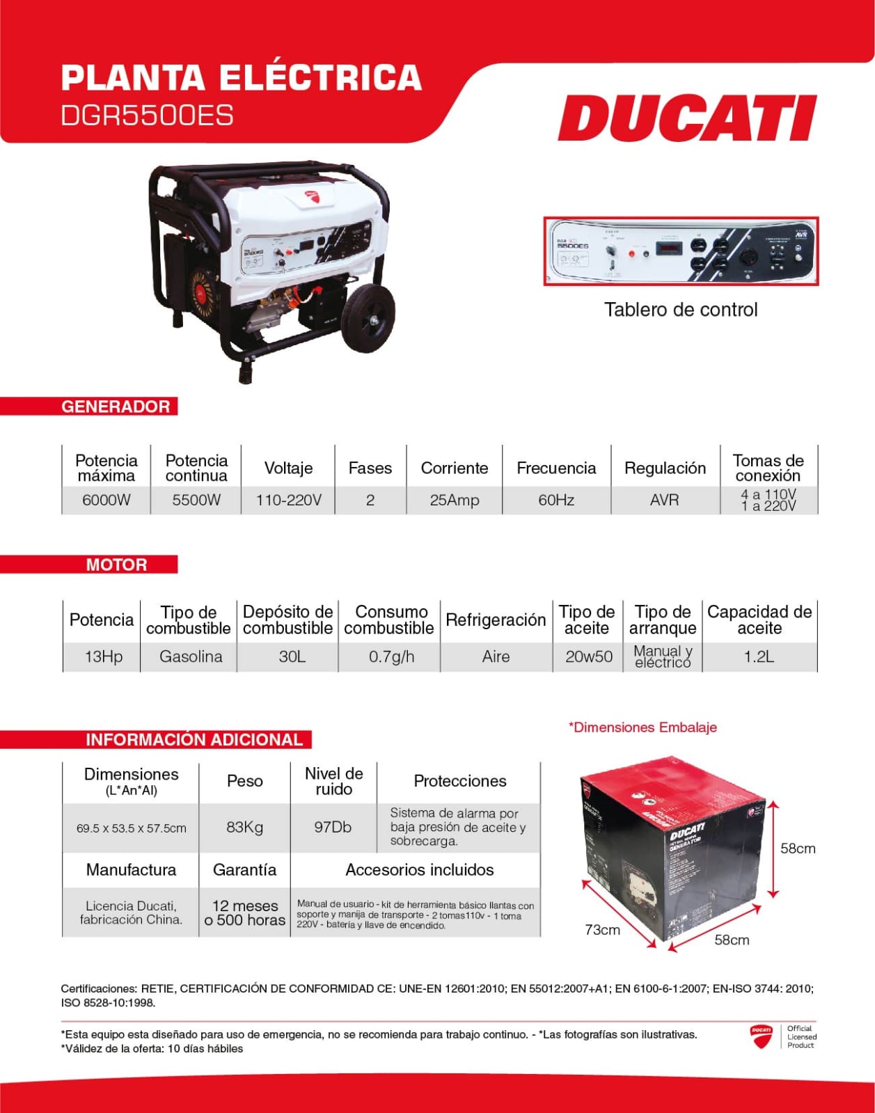 Caracteristicas de la Planta Electrica DUCATI 6000 W – DGR5500ES – GASOLINA: